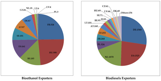Measures indicating the extent to which agricultural products are used by individual EU Member States to produce RES included biofuel exports. The export volumes of bioethanol and biodiesel were included as stimulants in the TOPSIS synthetic indicators. The main exporters of bioethanol in the EU included France, Hungary, Belgium, Spain, and Sweden, while the largest exporters of biodiesel included Germany, Spain, the Netherlands, Poland, and France (Figure 5). It should be mentioned that some EU Member States are showing considerable interest in the use of biofuels in transport, which is contributing to an increase in biofuel trade within the EU single market. Such countries are Germany, Sweden, and Spain, which, in addition to being major exporters of biofuels, are also significant importers of bioethanol and biodiesel (Germany ranked first in imports of both types of biofuels between 2010 and 2021, followed by Sweden). Regarding biodiesel, in the analysed period, most EU countries and the whole EU had a negative balance of trade—they imported more than they exported. The exceptions were Bulgaria, Germany, Spain, Latvia, Lithuania, Hungary, the Netherlands, and Austria, which noted a positive balance of trade for biodiesel in 2021. The situation was similar for bioethanol, where the whole EU had a negative balance of trade in 2021 (−793 thousand tonnes). In 2021, a positive balance of trade for bioethanol was recorded only in Belgium, Spain, Hungary, and Austria.
