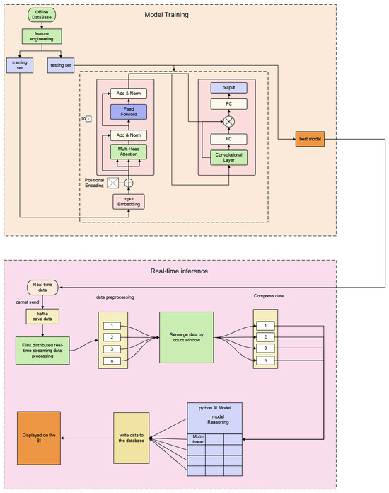 Our machine learning workflow in the case study is bifurcated into two primary processes: model training and real-time inference. During the model training phase, as depicted in Figure 5, we commence with an offline database, which undergoes feature engineering to prepare the training and testing sets. The model architecture includes an input embedding layer, followed by positional encoding. The core of the model comprises several blocks, each consisting of multihead attention and feedforward networks, integrated with add and norm layers for normalization. The output of the model is processed through a convolutional layer and subsequent fully connected (FC) layers to produce the final predictions. The best-performing model, as determined by our evaluation using the testing set, was then selected for deployment.