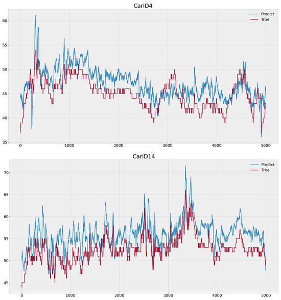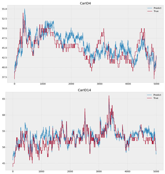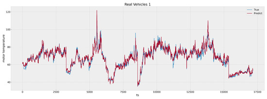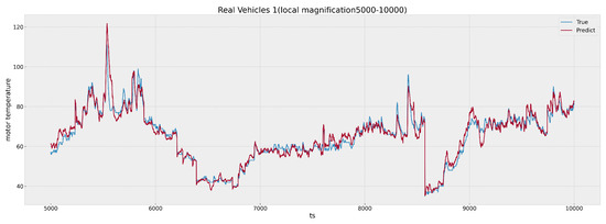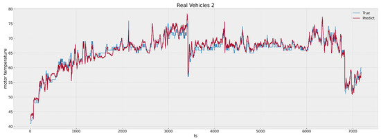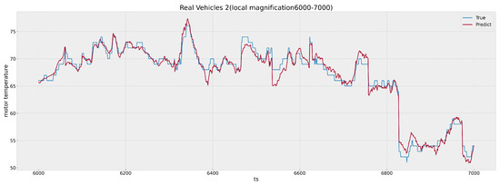 Figure 9, Figure 10, Figure 11 and Figure 12 illustrate the predictive performance of our model over a 24 h period in two randomly selected real cars, beginning on 29 September 2023 at 00:00 and ending at 23:59. Figure 10 and Figure 11 show the effect (after local magnification) of the time points from 5000 to 10,000 and from 15,355 to 17,157 in Figure 9; Figure 13 shows the effect (after local magnification) of the time points from 6000 to 7000 in Figure 12. The graph shows the plots of two lines representing the actual and predicted motor temperatures. The blue line signifies the real-time temperature readings (denoted as ‘True’), and the red line depicts the model’s predictions (denoted as ‘Predict’). The X-axis of the graph marks the time points when all the driving segments of the day are concatenated together, while the Y-axis denotes the temperature values. A visual inspection of the plot indicates a close correspondence between the predicted and actual temperature values, reflecting the model’s high degree of accuracy.