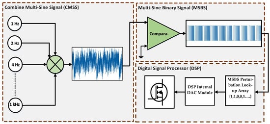 The MSBS is a two-level signal obtained through the direct mapping of the CMSS to an equivalent binary level. The multi-sine signal is clipped at an average value, the amplitude instantaneous value greater than the average is mapped to binary high (+A), and the less-than-average value is mapped to binary low (−A). The mapping of the CMSS into the MSBS is represented by (7). The resulting MSBS inherits both the advantages of PRSs and multi-sine signals. It is a two-level signal, which simplifies the generation of algorithms and hardware. The CF is equal to that of the PRS (CF = 1.0), and the frequencies of interest are selectable. Some additional harmonics appear along with the frequencies of interest in the FFT of the MSBS. However, these harmonics have small amplitudes and 70 to 85% of the signal power is concentrated at the desired frequencies [14]. The MSBS generation using (7) is represented by a block diagram, as shown in Figure 2. This process is implemented in LabVIEW, and the resulting MSBS is converted into a look-up array for coding in the DSP.
