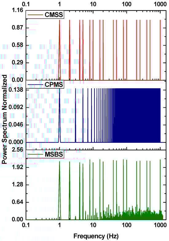 The normalized power spectra of the CMSS, CPMS, and MSBS are represented in Figure 3. The normalization is with respect to the CMSS for relative analysis. The CMSS and MSBS contain 17 frequency components ranging from 1 Hz to 1 kHz. The specific frequencies are 1, 2, 4, 8, 10, 16, 20, 40, 50, 80, 100, 200, 250, 400, and 1 kHz. The CPMS, based on Schroeder phase insertion and having optimal CF compared to CMSS, consists of linearly distributed frequencies. In the given CPMS, 500 harmonics are included between 1 Hz and 1 kHz with a 2 Hz frequency step. The logic behind such a dense frequency distribution is to measure the impedance in a lower frequency range and observe the battery electrochemical phenomena occurring in a lower frequency range (≤10 Hz).