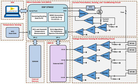 The perturbation responses of the batteries are sensed and measured using a sensing and conditioning circuit, which comprises a high-precision current sensor, high-pass passive filters, active low-pass filters, and gain amplifiers. The perturbation responses are read through the internal and external ADC ICs and then processed by the DSP.