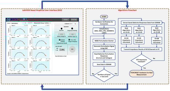 A flowchart of the DSP codes for the proposed EIS system, along with the graphical user interface (GUI) developed in LabVIEW, is shown in Figure 5. The GUI generates a control command for a given EIS test based on the user’s setting, which is then sent to the hardware. Once the DSP receives the control command from the GUI, it is decoded, and the EIS test begins according to the user setting. The DSP generates a reference broadband MSBS to perturb the batteries. The perturbation responses of the batteries are recorded, and the data are saved in an external SDRAM. The impedance spectra for all eight batteries are calculated and the data are sent to the PC. The impedance spectrum data received by the GUI are decoded, plotted for the respective channels, and saved in Excel and text files for further analysis.