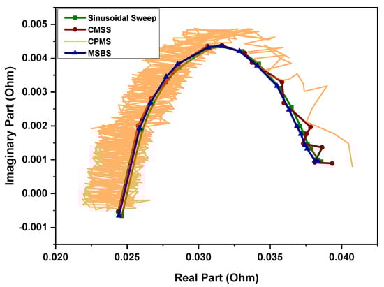 Nyquist impedance plot using sine-sweep, CMSS, CPMS, and presented MSBS perturbation.