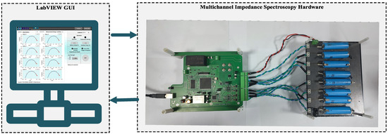 The validation of the proposed high-speed multi-channel EIS system was conducted by comparing the results with those obtained from a commercial EIS instrument named “BIM2” developed by BRS Messtechnik [34]. The experimental setup for the proposed EIS system is shown in Figure 7. A battery module which consists of eight lithium-ion Samsung INR18650-29E batteries connected in series was used for the validation experiment. The impedance spectrum of each battery was simultaneously obtained and displayed on the LabVIEW-based GUI.
