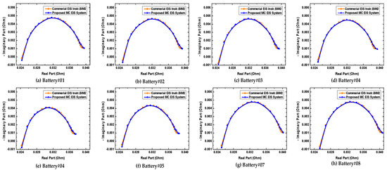 Nyquist impedance plot comparison obtained using the proposed high-speed multichannel EIS system and commercial EIS instrument “BIM2” (Battery 01–08).
