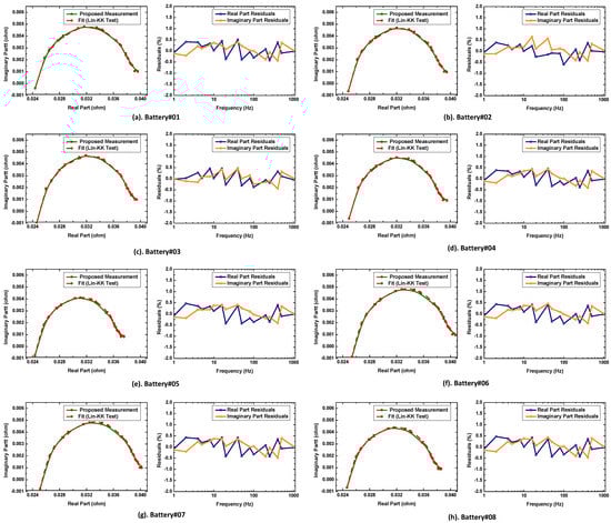The Lin-KK software developed by the Karlsruhe Institute of Technology (KIT) is used for the robust validation of the KK-compliance test [35]. This tool is based on fitting the impedance spectra to a linearized Voigt circuit with multiple RC elements. The residuals of the real and imaginary components are between the measured and fitted data. The residual should be less than 0.5% for the validity of the measurement under the conditions of an LTI system. Impedance spectrum data are valid if the residuals are random or white-noise distributions. However, the data are corrupted if the residuals follow some clear traces or patterns. The validity of the impedance spectrum through the KK compliance test guarantees its usability for the state estimation of a battery. The KK compliance test of the impedance spectra of Samsung INR18650 batteries obtained through the proposed high-speed multi-channel EIS system is performed. The fitted impedance spectra and the corresponding residuals are shown in Figure 9. All the residuals are random, unbiased (no time variance), and less than 0.5%, which validates the presented broadband MSBS perturbation and high-speed multichannel EIS system.