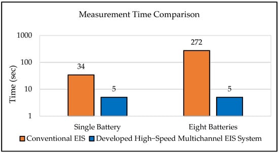 Comparison of measurement times between conventional EIS and proposed high-speed multichannel EIS system for impedance spectra measurement of 8 batteries.