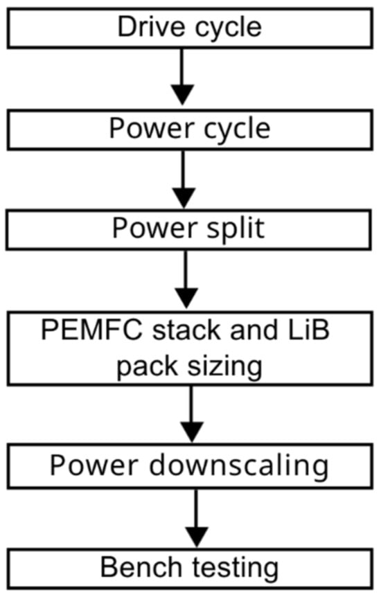 Overview of project methodology. First, a drive cycle was converted to a required power cycle. The power cycle was then split between the PEMFC stack and LiB pack; a general overview of the size of the stack and pack could then be identified. Lastly, the power cycle requirements of the stack and pack were downscaled to a cell level, which can then be used to facilitate device bench testing or cycling.