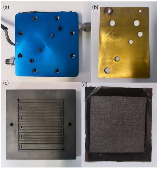 Overview of PEMFC assembly. (a) BiP from Scribner Associates. (b) Current collector from Scribner Associates. (c) Flow field plate from Scribner Associates. (d) MEA manufactured in-house using HyPlat GDE and Gore PTFE membrane.