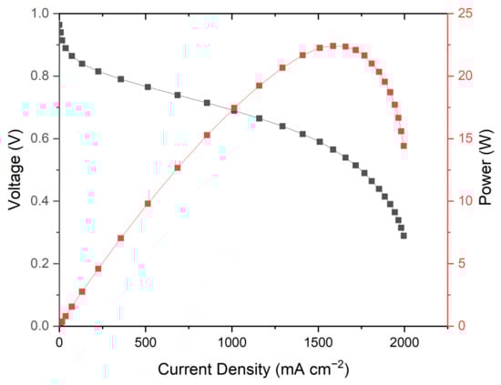 Sample polarisation (black) and power curve (red) of fabricated PEMFC. All properly fabricated PEMFCs for this project needed to exceed a maximum power of 20 W, with an OCV no less than 0.9 V. The current density at 0.3 V should be more than 1600 mA cm−2.