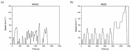 Drive cycles are standardised driving data published in a speed vs. time format []. The dynamic load cycling endurance test was used to simulate 100 cycles of HGV urban driving, a distance of approximately 530 km, representing the break-in period of a vehicle. Typically, vehicle manufacturers do not recommend highway driving during this break-in period, so an urban-based drive cycle was the optimal choice for this analysis. The total distances of drive cycles were calculated by integrating the speed vs. time curves. The procedures for dynamic load testing took inspiration from FCH JU’s dynamic load cycling endurance test protocols. The FCH JU protocol was created for FCEVs (non-hybrids) and utilises the NEDC drive cycle []. However, the NEDC cycle is primarily a light-duty vehicle (LDV) modal drive cycle and is now considered outdated and less representative of realistic driving representation when compared to a WHVC and newer transient drive cycles []. Transient drive cycles are usually collected based on real-life driving data []. Figure 4 shows a comparison between WHVC Urban and the commonly used NEDC. As seen, WHVC Urban has a lower average speed that is more representative of HGV driving and is more transient and realistic than NEDC.