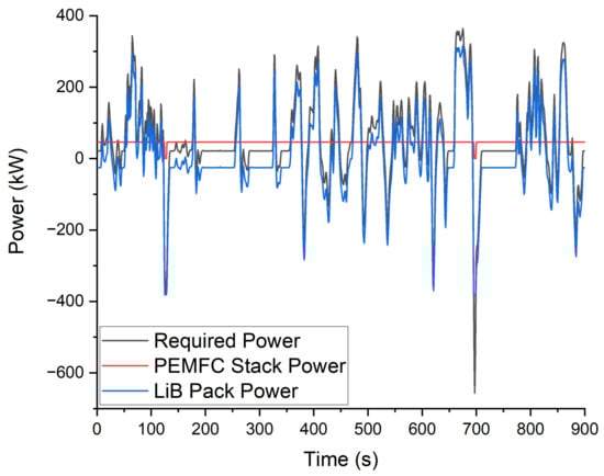 Required (black), PEMFC stack (red), and LiB pack (blue) power comparisons. The PEMFC stack stays at a constant power while the LiB pack accounts for peak load and dynamic demands. The PEMFC stack may need to ‘shut-off’ during certain timestamps to prevent overcharging the battery. The PEMFC and LiB power combined should equate to the required power.