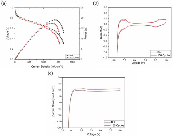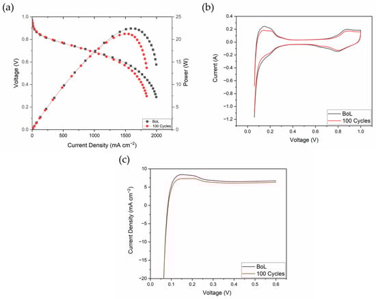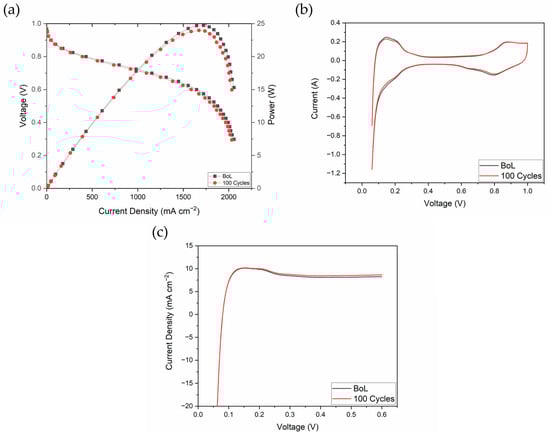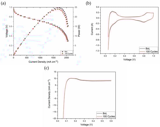 Electrochemical degradation analysis of the MPML scenario, comparing BoL and EoT. (a) Polarisation and power curve. (b) Cyclic voltammetry (CV) for comparison and electrochemical surface area (ECSA) estimation; an 11.68% ECSA drop occurred. (c) Linear sweep voltammetry (LSV).