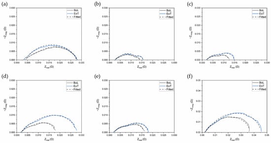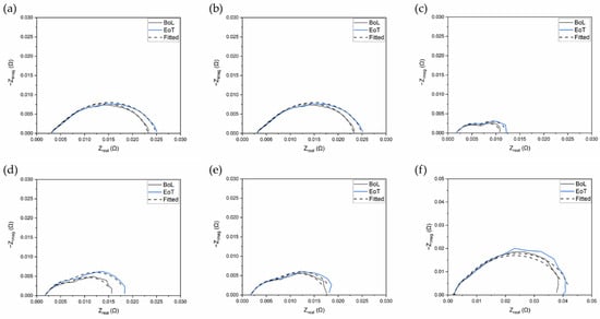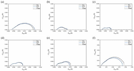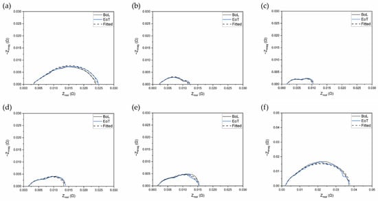 Galvanostatic and potentiostatic EIS Nyquist plots at different current densities and voltages for the MPML scenario. (a) 100 mA cm−2; (b) 300 mA cm−2; (c) 800 mA cm−2; (d) 1200 mA cm−2; (e) 0.65 V; (f) 0.5 V.