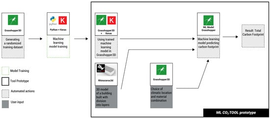AI has been identified as one of the answers to the problem of data accessibility and decision making with LCA early in the design process, allowing designers to perform analyses without a finished 3D model [32]. Machine learning-based solutions are based on either access to a pretrained model or to a dataset that can be used for training the model. In the first case study, an experiment was conducted by training the model using a simulated dataset. The creation of a simulated dataset was proposed by Galanos [29]. In this case study, the authors investigated a tool that can predict building carbon footprints based on a trained machine learning model. The authors chose Rhinoceros 6 and Grasshopper due to the possibility of using automation by applying visual scripting in Grasshopper. The authors developed a script that uses machine learning to estimate the carbon footprint during the architectural design phase. This tool can be utilized during the initial design stages, improving the understanding of the connection between a building’s form and its overall carbon footprint.