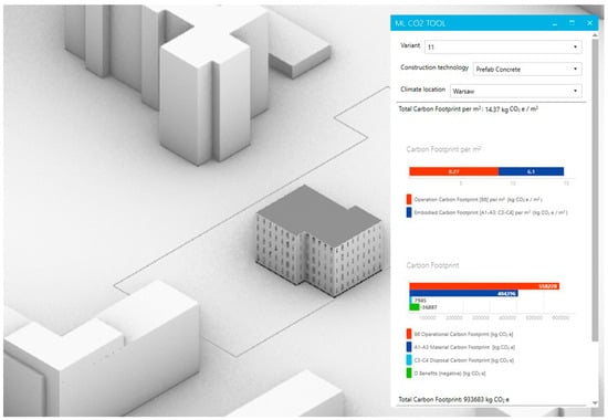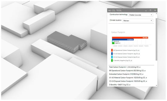 The result of this study was a trained neural network capable of predicting the total carbon footprint of a design proposal when using limited information. This information includes parameters such as the wall area, ground floor area, roof area, height, window area in different orientations (south, north, west, and east), and the urban layout, all automatically captured from the model created by the user inside Rhinoceros 6. The results are presented to the user using a user interface (UI) created using the Human UI plugin for Rhinoceros 6 and Grasshopper [59] (Figure 3). The tool was released as open source [60].