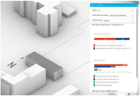 The program estimated the carbon footprint of the initial building alternative at 15.18 kgCO2eq/m2 (Figure 4). The different alternatives for the building related to different building shapes, locations on the plot, and construction technology systems [56]. The 3 selected variants that have been presented in this article were based on 3 different construction technologies: brick and concrete frame (Figure 4), a prefabricated concrete system (Figure 5), and a cross-laminated timber system (Figure 6). The final variant had the lowest carbon footprint of all the analyzed alternatives at 11.29 kgCO2eq/m2 (Figure 6), which represents a reduction of approximately 25% in terms of the carbon footprint compared to the initial variant. The design process was supported by analyses performed using a prototype tool to find the shape and parameters of a building with a much lower carbon footprint than the initial assumptions.