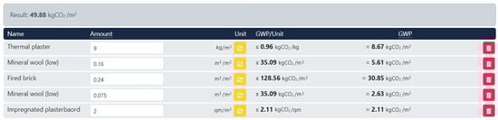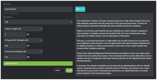 A user would typically upload a building model in the form of a file of the IFC 2 × 3 type [82]. The IFC file is then saved to the database, and a bill of quantities is automatically generated. The next step includes the designer predefining building components by selecting the material and quantity for each layer of the component (Figure 13). In the example, the AI suggests replacing a few materials, for example, using cellulose insulation instead of EPS material to lower the carbon footprint—EPS: 118.4 kgCO2eq/m3; cellulose fiber insulation: 12.31 kgCO2eq/m3 [58].