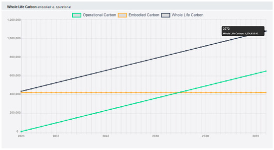 Example of the results provided by the application. The user can compare the embodied carbon with the operational carbon and find the break-even point (own elaboration by the authors).