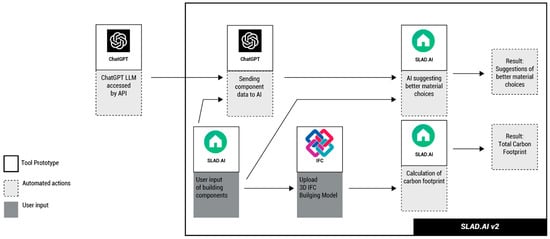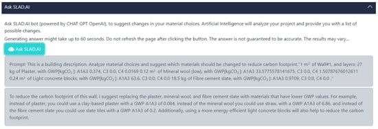 To utilize the power of LLMs in architectural design, an online carbon calculator tool was created (Figure 7). It was developed in JavaScript and consists of basic functionalities required to calculate carbon footprint. The tool uses the Ökobaudat database of emission factors of different building materials [58]. A user can create an account by visiting the web page www.slad.ai (accessed on 1 April 2024), and then create a building model [66]. In the next step, the designer should place all the building components by creating their material composition. The user has access to the Oeakobau.dat library or can add information about the material from an EPD (Environmental Product Declaration). Finally, the quantity of the given component is specified. By inputting information on building elements and selecting the correct corresponding Oeakobau.dat materials, a full building model can be created (Figure 8 presents values of example materials, and GWP/unit presents the sum of A1–A3, C3, and C4 lifecycle phases). The tool then calculates the carbon footprint of the building in the A1–A3 and C3–C4 phases—the embodied carbon footprint (Figure 9). If the designer enters the results of an energy simulation from another application, the operational carbon footprint can also be calculated.