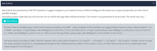 Using ChatGPT’s OpenAI API (Application Programming Interface), the SLAD.AI website was connected to the ChatGPT LLM gpt-3.5-turbo-instruct [67]. After specifying the building model in the application, the user can ask ChatGPT for suggestions. The application sends the building description to the ChatGPT server and waits for a response. The response is then displayed to the user.