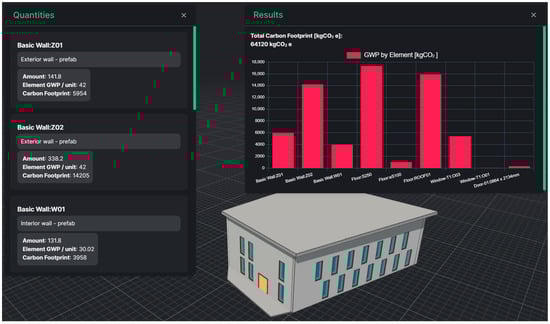 Overview of the 3D viewer with the carbon footprint calculation module with the automatically generated bill of quantities—the result of 64,120 kgCO2eq/m2 for the embodied carbon of the analyzed building (own elaboration by the authors).