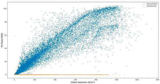 With increasing global attention on renewable energy, photovoltaic (PV) power generation has garnered widespread attention and application as a pivotal solution to address the global energy demand, owing to its clean and sustainable nature. However, the operation and monitoring of PV power generation systems often generate a large amount of data, which may contain missing values, outliers, and noise, posing significant challenges for data analysis and application [1,2,3,4,5]. Therefore, PV data cleaning plays a crucial role in ensuring data quality, improving data availability and reliability [6,7].