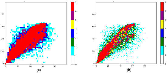 The data cleansing process essentially involves retaining frequently occurring data points while eliminating those that occur infrequently. In the Central China region, total radiation values range from 0 to 1500 W/m2. For a PV station with an installed capacity of 150 MW, if the data are rasterized using a ratio of 1 W/m2 to 1 kW, a maximum of 1500 × 1500 grid blocks will be generated. The PV data mapped to grid blocks were then tabulated to generate a rasterized data table containing data quantities, as depicted in Figure 3.