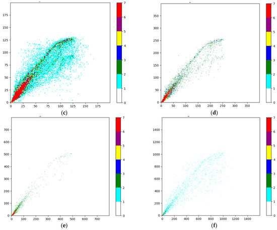 To reduce errors during image processing caused by rasterizing the data, it is common practice to maintain the image size as a power of 2. Therefore, this study sets the maximum resolution of the images to 1600 × 1600. Additionally, resolutions of 800 × 800, 400 × 400, 200 × 200, 100 × 100, and 50 × 50 are designed. According to the processing method described, it is known that smaller thresholds in contour extraction can yield larger contour areas. Hence, in this study, only the values 1–6 are analyzed for the threshold. The most reasonable parameters satisfying cleaning criterion Jw are selected. The six different-resolution images corresponding to thresholds 1–6 are shown in Figure 9.