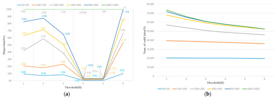 By applying threshold selection, the binarization of images with different resolutions can be performed, and the corresponding largest contours can be extracted. We consider the power irradiance scatter data contained within the largest contour as valid data and calculate the weighted dispersion Sk of these data. As shown in Figure 10a, the higher the resolution of the image, the greater the weighted dispersion. Except for the rasterized image with a resolution of 1600 × 1600, the weighted dispersion of valid data contained within the largest contours at other resolutions achieves its minimum value when the threshold is 4 or 5. Subsequently, as the threshold increases, the weighted dispersion also increases. This is understandable, since higher thresholds result in fewer valid data points being included (see Figure 10b). Since we aim for the smallest possible weighted dispersion, the threshold selection only needs to consider values less than 6. Additionally, we observe that as the resolution decreases, the number of valid data points increases. When the resolution is reduced to 100 × 100, the number of valid data points tends to stabilize. Our goal is to include as many valid data points as possible; thus, analyzing resolutions of 50 × 50 and above is sufficient.