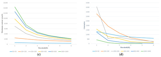 Threshold vs. different parameters (different resolutions). (a) Threshold vs. Dispersion, (b) Threshold vs. Num. of valid data, (c) Threshold vs. Maximum contour area, (d) Threshold vs. Cleaning Criterion.