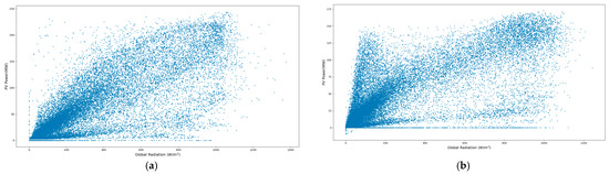 Relationship between global radiation and PV power: (a) Station of Yongxin; (b) Station of Gangping.