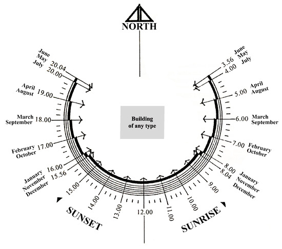 The illumination of a building’s interior is variable and dependent on external factors such as weather, season, time of day, etc. Therefore, an important element in the design of any building is the orientation of its rooms in relation to the cardinal points. At the same time, the destination of the premises must be considered. North is generally considered the best side for a reading room, as this orientation makes it possible to provide diffused light and avoid direct sunlight entering the room. It can be seen from Figure 1 that the north façade of the building receives sunlight only in summer: in the morning and the evening.