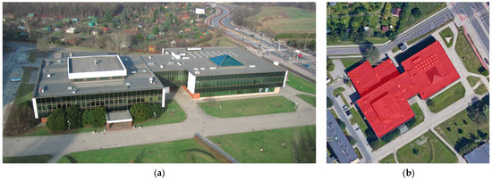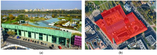 The location of the SGGW Library: (a) a view of the library building from the southeast [38]; (b) the ground floor plan of the library building.