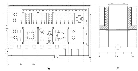 SGGW library reading room: (a) floor plan; (b) skylight cross-section. Author: I. Voronkova (own study based on [41]).