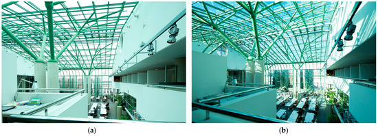 The natural light intensity in the reading room of the UW Library under different weather conditions: (a) on a cloudy day; (b) on a clear day. The photo was taken from the mezzanine of the reading room. Author: I. Voronkova.