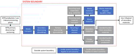 The functional unit for this assessment is 1 kg of WTB waste processing with any of the material compositions described in the study (e.g., as described in Section 2.3.3). The reference flow is 1 kg of WTB.