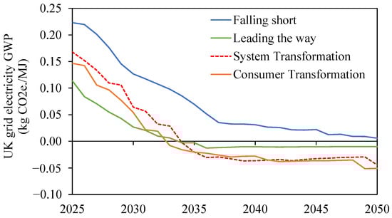Four grid mix scenarios are considered based on UK National Grid ESO Future Grid report [25]: (1) Falling short, (2) Leading the way, (3) System transformation, (4) Consumer transformation. Figure 2 shows the projected UK grid mix GWP for each scenario between 2025 and 2050. “System transformation” future grid mix scenario has been selected as the reference scenario used in most future grid scenarios in this study. It is the scenario with the lowest Root Mean Square Error calculated between each scenario and the hypothetical average scenario represented by the average values of the four scenarios above. “System transformation” scenario is therefore the one which is closest to the average of the four scenarios.