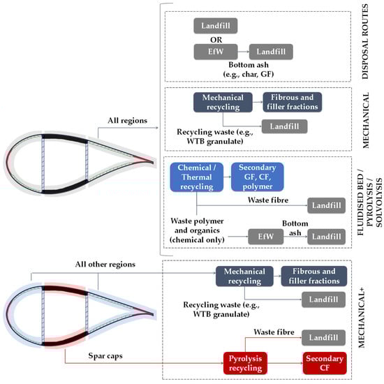 Schematic showing how each of the WTB regions are processed across each EoL scenario.