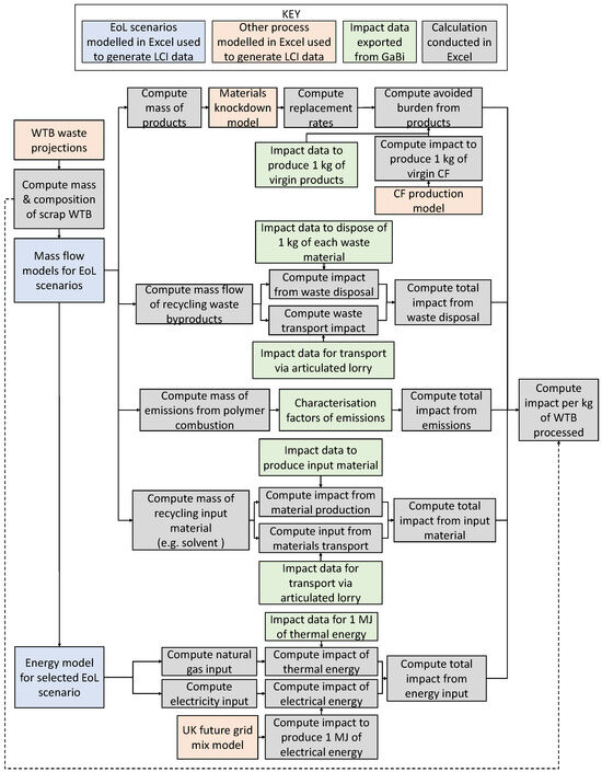The following supporting information can be downloaded at: https://www.mdpi.com/article/10.3390/en17123008/s1, Figure S1: Maximum throughput and relative energy demand of a range of shredders with differing capacities; Figure S2: Process flow for WTB disposal in landfill; Figure S3: Process flow for WTB disposal using incineration with energy recovery; Figure S4: Process flow for WTB recycling using mechanical recycling when spar cap is not removed; Figure S5: Process flow for WTB recycling using mechanical recycling when spar cap is removed (Mechanical+); Figure S6: Process flow for WTB recycling using fluidised bed process; Figure S7: Process flow for WTB recycling using pyrolysis process; Figure S8: Process flow for WTB recycling using solvolysis process; Figure S9 Detailed flow diagram showing the calculation procedure used to conduct the LCA; Table S1: Assumed transportation distances for WTB waste; Table S2: Datasets used for estimating impact when landfilling the various blade materials; Table S3: Mechanical recyclate fractions; Table S4: The change in fibre-resin and filler-resin weight ratio in mechanical recyclate fractions; Table S5: Energy input during fluidised bed recycling; Table S6: Energy input during pyrolysis recycling; Table S7: Energy input during solvolysis recycling; Table S8: Material input during solvolysis recycling; Table S9: Chemical composition, combustion products and calorific value of various materials used in LCA; Table S10: Composition of model composite used in fibre knockdown assessment; Table S11: Input data used to calculate composite tensile strength using recycled glass fibres; Table S12: Input data used to calculate composite tensile modulus using recycled carbon fibres; Table S13: BMC knockdown factor and fibre weight fraction for each recycling technology; Table S14: Assumptions in grid mix contributions for Falling short and Leading the way scenarios; Table S15: Assumptions in grid mix contributions for System Transformation and Consumer Transformation scenarios.