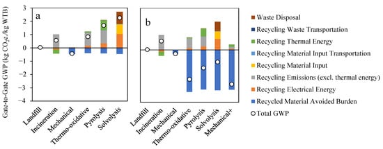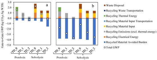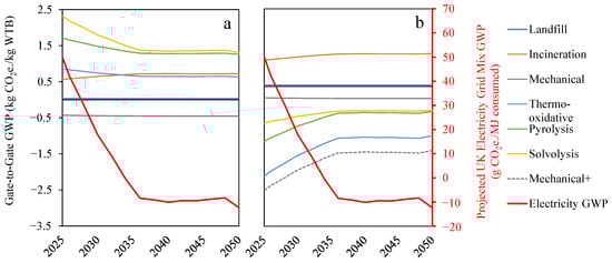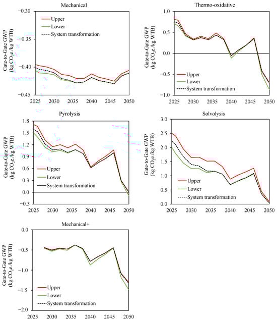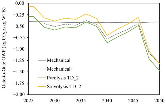 GWP of recycling technologies and TD_2 development scenarios using projected 2025–2050 UK (System transformation) electricity grid mix and projected 2025–2050 UK mixed WTB feedstocks.