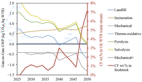 The expected increase in CF within the mixed WTB feedstocks is a crucial factor in assessing the long-term impact of recycling strategies. This CF content growth expands the potential for avoided burden related to secondary CF products, favouring technologies capable of recovering CF from the mixed WTB waste stream.