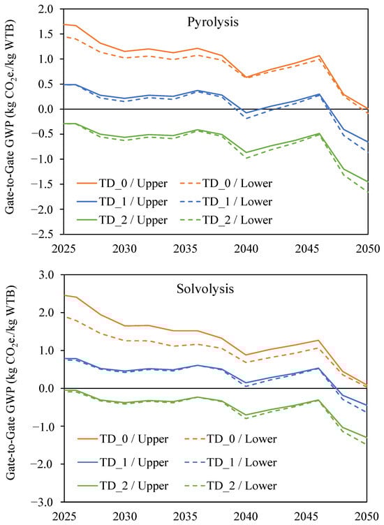The analysis depicted in Figure 13 considers the impact of uncertainty in the future grid mix on the GWP projections for both pyrolysis and solvolysis recycling across the three technology developments. The GWP of each recycling technology development was evaluated between 2025–2050 for each of the UK electricity grid mix scenarios (Falling short, Leading the way, System transformation, and Consumer transformation), with Figure 13 presenting the range encompassing the highest and lowest GWP values for each year assessed. Figure 13 shows that scenarios with no technology development (Pyrolysis TD_0 and Solvolysis TD_0) produce greater variation in GWP, due to higher electricity demand compared to TD_1 and TD_2 scenarios.