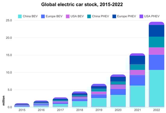 Electric vehicles are trendy in China, Europe, and the United States of America. Figure 1 shows that the growth of EVs is exponential, especially in China, where BEVs (battery electric vehicles) have grown from 0.2 million in 2017 to 10.7 million in 2022. Europe and the USA have also seen significant growth from 2017 to 2022, from 0.2 million to 4.4 million in the first case and from 0.2 million to 2.1 million in the second case [].