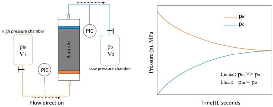 There are two well-known methods to measure absolute permeability in the laboratory, namely, steady-state and transient methods [44,45]. The steady-state method requires the injection pressure and flow rate of the fluid through the sample to be constant over a period of time and the permeability is calculated simply by applying Darcy’s law. Therefore, the steady-state method is not appropriate to measure the permeability of tight materials where a very little amount of fluid can flow through the sample over a long period of time, and it is hard to attain steady-state conditions within an acceptable measurement time. Conversely, the transient method is very effective and accurate for tight materials of less than 1 mD. At our institute, we developed a setup based on this method to measure the permeability of rocks and any tight material down to 1 × 10−24 m2. Figure 3 illustrates the measurement principle, which is described as a two-chamber permeability measurement system. The measurement setup consists of an inlet and outlet chambers and a core holder for cylindrical samples. Before starting the experiment, the inlet chamber is pressurized to a high pressure (e.g., 2 MPa) while the outlet chamber is set to a lower pressure (near or atmospheric pressure). When the connection between both chambers across the sample is open, the measurement begins by recording the pressure profiles at the inlet and outlet of the sample (normally inlet and outlet chambers). Based on the recorded pressure development and the known geometry of the sample, the permeability of the sample is calculated through the following partial differential equation that is developed for the system,