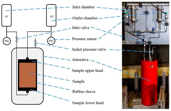Figure 4 shows the small-scale setup. The system consists of two pressure chambers and an autoclave where the sample to be measured is located. The autoclave is filled with hydraulic fluid, which allows jacket pressure to be applied to the sample. To protect the sample from hydraulic fluid, it is covered with a rubber sleeve. There are stainless steel head plates on both sides of the cylindrical sample, which connect to the gas line. The pressure chambers, lines, and the pore space of the sample form a closed flow loop. The volumes of all the gas-carrying add-on parts are known and the pressure on the inlet and outlet side is recorded by pressure sensors. All attachments (pressure sensors, diaphragm valves, and piping) are attached to an aluminum panel placed above the autoclave.