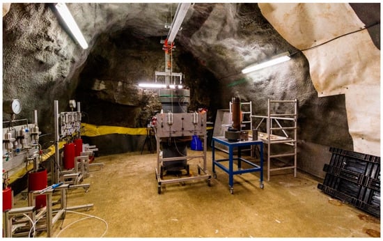 Both experimental facilities (small- and large-scales) are built in an underground mine that belongs to TUBAF. The mine depth is around 150 m and the temperature is constant at 14 °C, which eliminates the need for air conditioning to maintain a constant ambient temperature. Figure 6 shows part of the laboratory with test facilities and the large-scale setup in the middle.