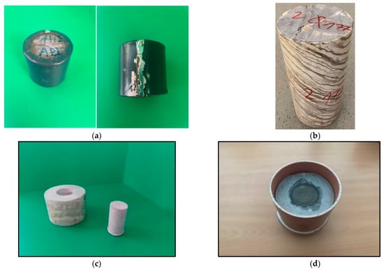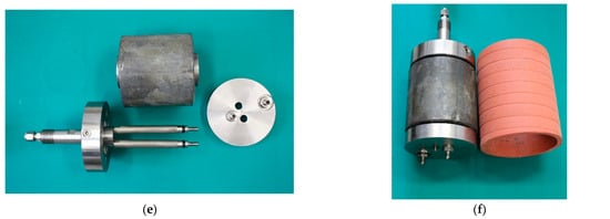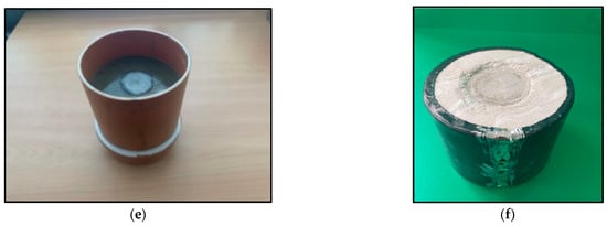 Figure 10 shows the cement–CT sample at different preparation stages; (a–b) shows the size of the CT pipe, (c–d) shows the size of the composite after cementation, (e) shows the core holder with the upper and lower head plates, and (f) after connecting the upper and lower head plates with the rubber sleeve on the right (in red). The rubber sleeve is essential to insulate the sample from the hydraulic fluid that applies the confining pressure on the sample.