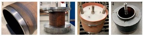 The third samples category replicates a short section of a real wellbore. They have the shape of a hollow cylinder and consist of a steel pipe surrounded by cement. The steel pipe is an X52-grade welded standard pipeline with an outside diameter of 168 mm and a wall thickness of 8 mm. The production of the cement sludge is analogous to the solid cylinder samples. The sample has an outer diameter of approx. 29 cm and a length of 16 cm. To produce the sample, the first step is to cut the steel tube to the desired length. Both ends of the pipe must then be scraped to 1.5 cm length, as these areas will later serve as sealing surfaces (Figure 8, No. 1). The pipe is then placed in a mold at both ends (Figure 8, No. 2) and covered with a rubber sleeve. The upper and lower molds determine the outside diameter and the height of the cement and thus ensure the desired sample shape. In order to prevent the casting molds from becoming detached, they were connected to one another via a spindle. After this preparation, the cement slurry was poured through the openings of the upper mold into the cavity between the steel pipe and the rubber sleeve until the level reached the desired height (Figure 8, No. 3). The two hose clamps placed at the level of the molds prevent the cement slurry from leaking out. After a setting time of 24 h, the cement was sufficiently strong to remove the rubber sleeve and molds (Figure 8, No. 4). The sample is then stored in a vessel with the respective cement mixing water for at least 28 days at ambient pressure and a temperature of 14 °C. During this time, sealing caps with O-rings were used to protect the sealing surfaces of the steel pipe from corrosion.